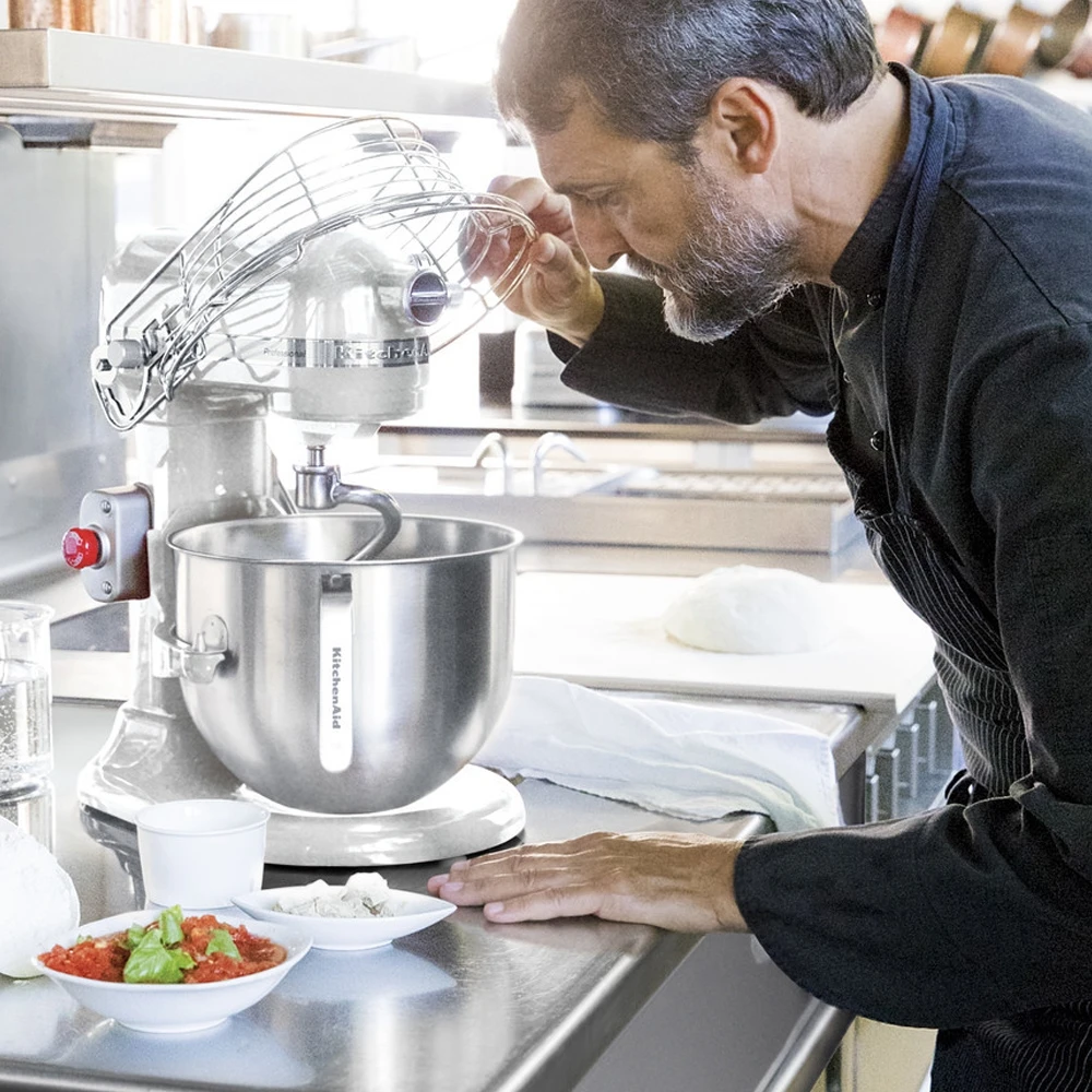 Der professionelle Standmixer mit 6,9 L – Schüsselheber, in den Farben Empire-Rot, Weiß und Silber Metallic erhältlich, zeichnet sich durch sein professionelles, abgerundetes Design aus. Der Hochleistungsmotor mit Direktantrieb arbeitet besonders leise, aber leistungsstark: die ideale Küchenmaschine, wenn Sie große Mengen verarbeiten müssen. Das robuste Ganzmetallgehäuse, das Präzisionsgetriebe aus Metall, der Kabelschutz und der Stopp-Schalter gewährleisten auch bei gewerblicher Nutzung Stabilität, Unempfindlichkeit, dauerhaften und sicheren Betrieb.