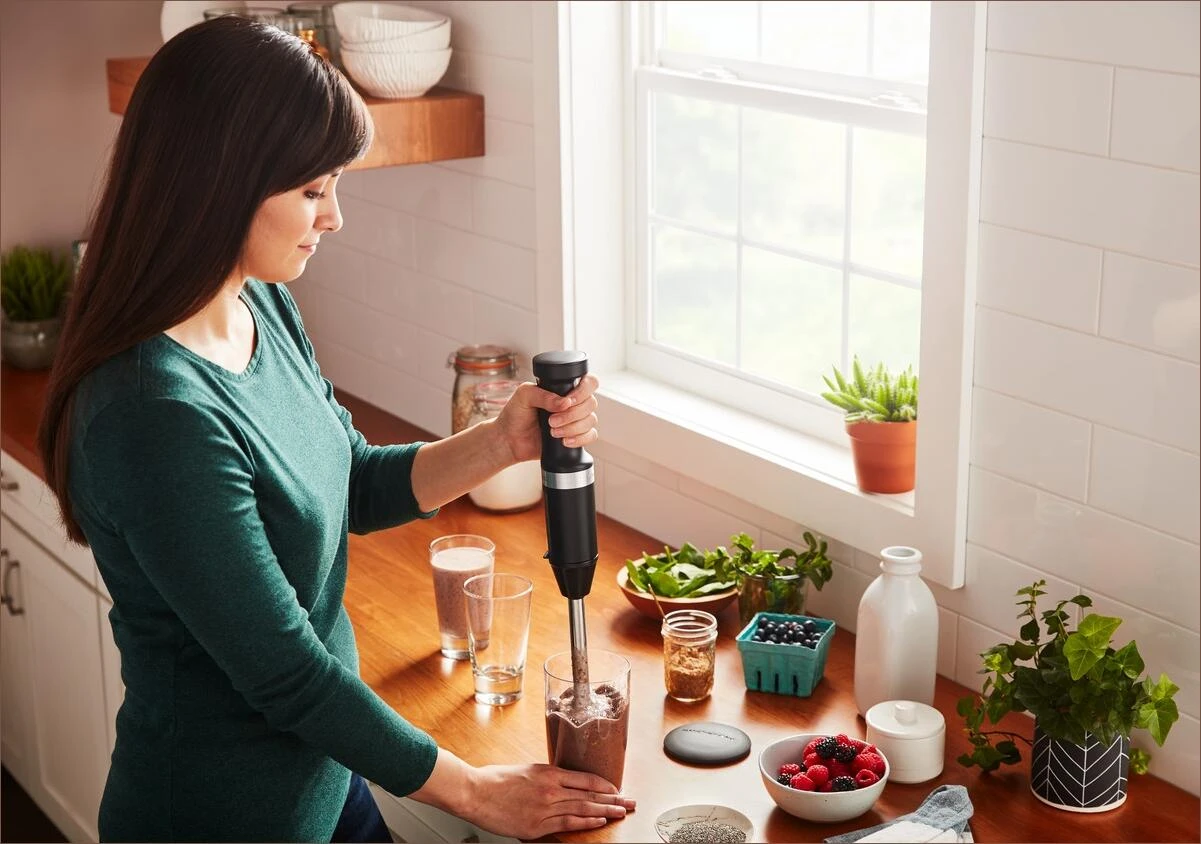 KitchenAid Kabelloser Stabmixer in matt schwarz. Der Mixer mit variablem Geschwindigkeitsregler. Mit wiederaufladbarem Akku und mit voller Bewegungsfreiheit in der Küche ohne Kabelsalat. Mit ca. 2h Akku-Laufzeit. Inklusive Zubehör.